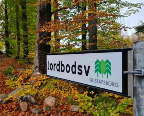 Gustafsborgs skogar har 114 olika vägnamn! De nya skyltarna har en reflekterande bakgrund som gör att de syns bra i mörker och självklart pryds de av vår tjusiga logga.
